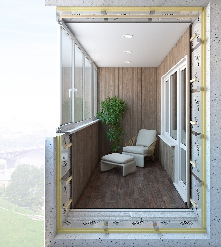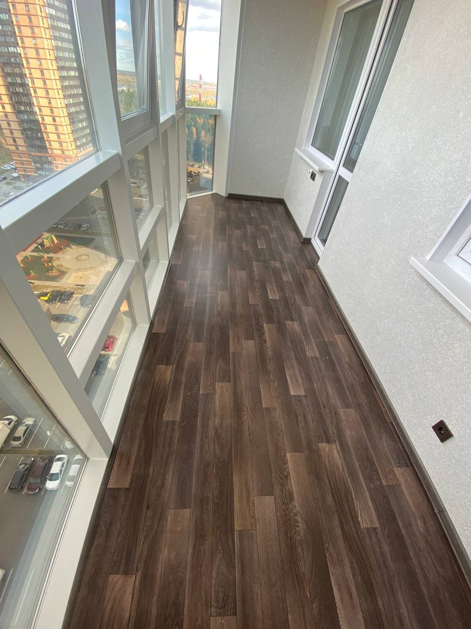 Тёплый на ощупь, с фактурами под камень, плитку, дерево, он практически не имеет конкурентов как материал для укладки на балконный пол. Кварцвинил бывает замковый и клеевой. Обшивка пола на балконе замковым кварцвинилом производится аналогично ламинату, с той лишь разницей, что под него часто не нужна подложка. Клеевой кварцвинил часто дешевле, но монтаж его дольше и сложнее.